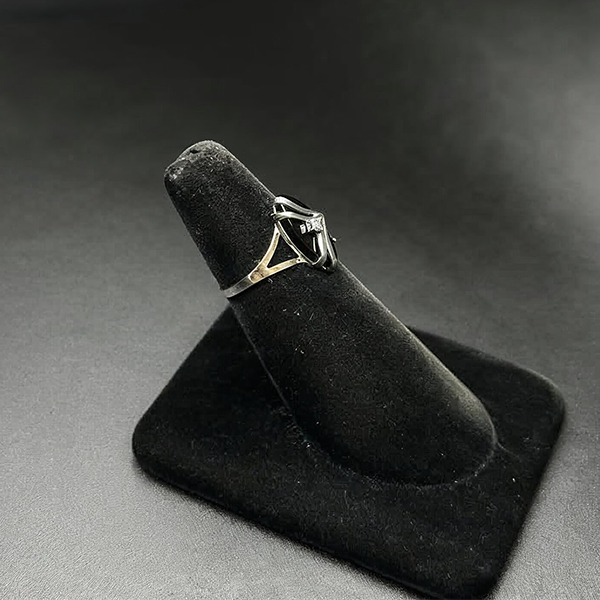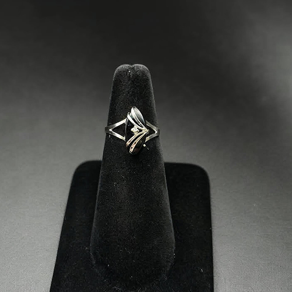Our 10k white gold ring in size 6 features a black onyx stone set prominently at the center, paired with a diamond placed to introduce a focused point of contrast. The arrangement remains secure through wear, keeping the stones aligned. Its finish allows both elements to appear clearly without competing visually. At $239.99, our ring offers a direct, structured presentation that supports the onyx and diamond equally, maintaining clarity and proportion throughout everyday use without shifting from its design.