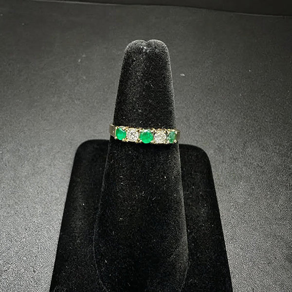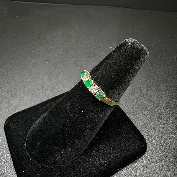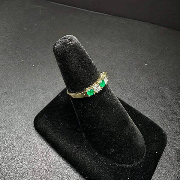 Our 18k yellow gold ring in size 7 combines brilliant-cut emeralds with diamonds in a layout that highlights the clarity of each stone. The arrangement is anchored securely, allowing the overall pattern to retain definition as the ring is worn. The higher gold content contributes a rich surface that enhances the visibility of the stones. Offered at $599.99, this piece presents a composed design that preserves both contrast and form, giving each stone deliberate placement within the ring’s structure.