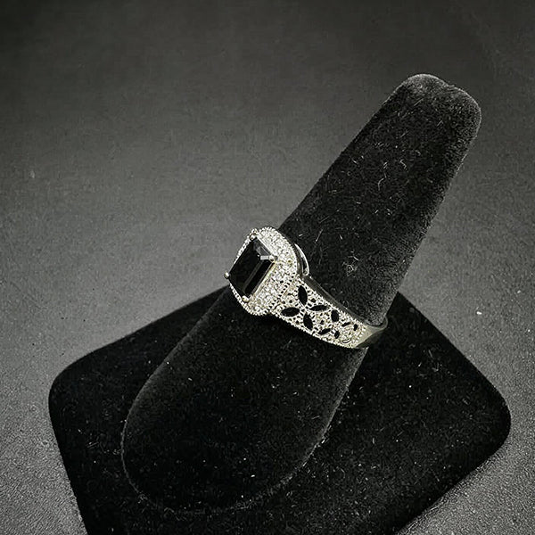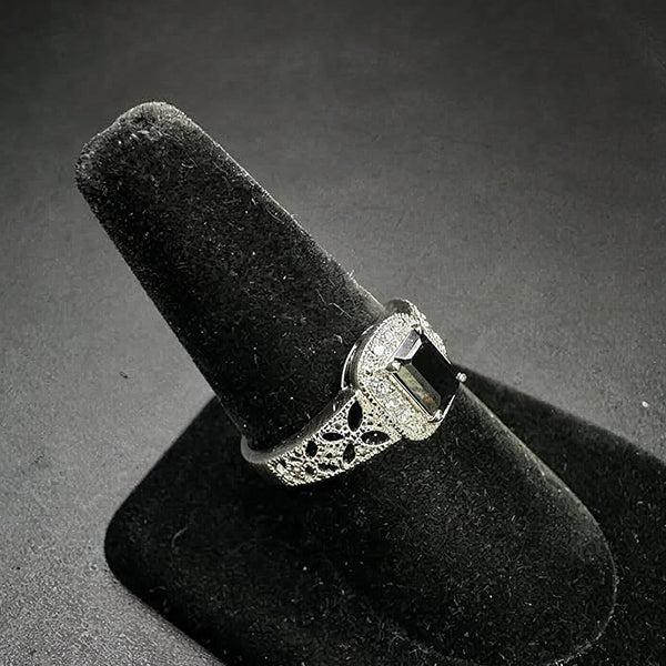 Our 925 vintage sterling silver ring with CZs and black onyx in the center is made in size 10 for steady comfort. The central onyx gives depth, while surrounding CZs add brightness in even proportion. We built the band with careful symmetry that stays secure and smooth on the hand. The silver keeps its tone clear through time. Valued at $59.99, our ring embodies contrast, texture, and design, crafted for a style that lasts beyond seasons.
